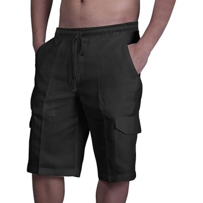 Men's Linen Shorts Casual Cotton Elastic Waist Drawstring Summer Beach Vacation Shorts with Pockets