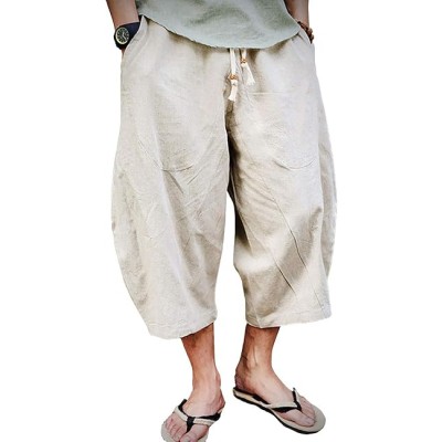 Mens Cotton Linen Capri Pants Light Loose 3/4 Long Shorts Elastic Waist Drawstring Harem Casual Beach Yoga Trousers
