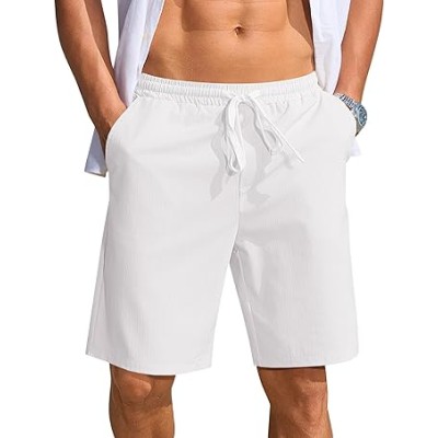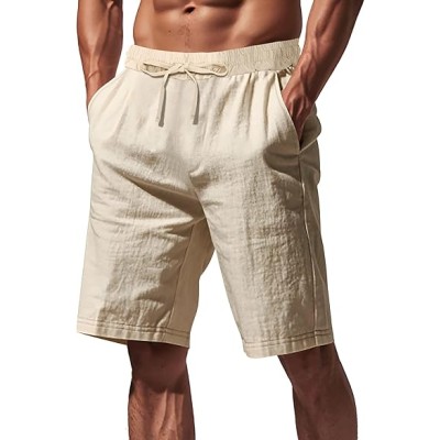 Men's Linen Shorts Casual Cotton Elastic Waist Drawstring Summer Beach Vacation Shorts with Pockets